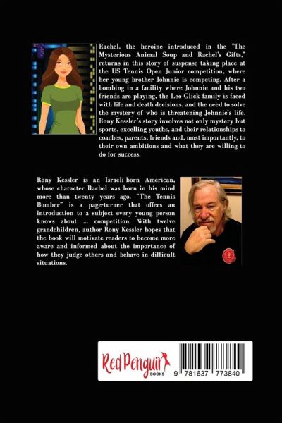 ¿Rachel, the heroine introduced in the "The Mysterious Animal Soup and Rachel's Gifts," returns in this story of suspense taking place at the US Tennis Open Junior competition, where her young brother Johnnie is competing. After a bombing in a facility where Johnnie and his two friends are playing, the Leo Glick family is faced with life and death decisions, and the need to solve the mystery of who is threatening Johnnie's life. Rony Kessler's story involves not only mystery but sports, excelling youths, and their relationships to coaches, parents, friends and, most importantly, to their own ambitions and what they are willing to do for success. Rony Kessler is an Israeli-born American, whose character Rachel was born in his mind more than twenty years ago. "The Tennis Bomber" is a page-turner that offers an introduction to a subject every young person knows about ... competition. With twelve grandchildren, author Rony Kessler hopes that the book will motivate readers to become more aware and informed about the importance of how they judge others and behave in difficult situations.