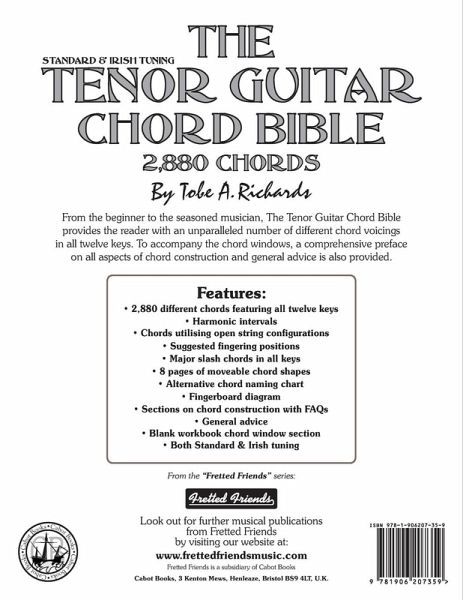 The Tenor Guitar Chord Bible, with its 2,880 chords (in standard and Irish tuning) offers a complete solution for both beginner and experienced professional musician alike. The layout is uncomplicated and follows a logical musical progression from standard major chords up to the more complex thirteenths used by many jazz players. To accompany the 2,880 chords, a useful range of 288 slash chords are also featured, reflecting the popularity of this type of chord in many of today's artist and compilation topline songbooks. This highly comprehensive guide provides the musician with no fewer than 36 different types of chord in all twelve keys in both standard CGDA and Irish GDAE tunings, making it the definitive publication for the Tenor Guitar. Whether you play folk, rock, pop, jazz or any other type of popular music, The Tenor Guitar Chord Bible makes the ideal reference source for all occasions. Standard Tuning Chords covered in The Tenor Guitar Chord Bible (using the key of C as an example): C, Cm, C-5, Cdim, C4, C5, Csus2, Csus4, Csus4add9, C+, C6, Cadd9, Cadd11, Cm6, Cmadd9, C6add9, Cm6add9, Cdim7, C7, C7sus2, C7sus4, C7-5, C7+5, C7-9, C7+9, Cm7, Cm7-5, Cm(maj7), Cmaj7, Cmaj7-5, Cmaj7+5, C9, Cm9, C11, C13. Irish Tuning Chords covered in The Tenor Guitar Chord Bible (using the key of C as an example): C, Cm, C-5, Cdim, C4, C5, Csus2, Csus4, Csus4add9, C+, C6, Cadd9, Cadd11, Cm6, Cmadd9, C6add9, Cm6add9, Cdim7, C7, C7sus2, C7sus4, C7-5, C7+5, C7-9, C7+9, Cm7, Cm7-5, Cm(maj7), Cmaj7, Cmaj7-5, Cmaj7+5, C9, Cm9, C11, C13. Major Slash Chords covered in The Tenor Guitar Chord Bible (using the key of C as an example): C/C, C/Db, C/D, C/Eb, C/E, C/F, C/F#, C/G, C/Ab, C/A, C/Bb, C/B. Beside the many pages of chord boxes or windows, the book features useful sections on tuning, chord construction, fingerboard layout, FAQs, alternative chord naming, fingering, slash chords, harmonic intervals, guitar family factfile, chord window blanks for transcribing your own favorite chord sequences etc. The aim of this guide is to provide the musician with the flexibility only really offered to 6-string guitar and keyboard players in the past. Now, with the help of The The Tenor Guitar Chord Bible, musicians will be able to pick up any songbook and instantly have access to even the most complex and advanced chords.