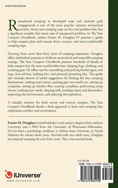 Recreational camping in developed state and national park campgrounds is one of the most popular summer recreational activities. Many tent camping trips are fun and problem-free, but a significant number face some type of unexpected problem. In The Tent Camper's Handbook, author Frazier M. Douglass IV presents a guide to help campers plan and execute dryer, warmer, and more comfortable camping trips. Drawing from more than forty years of camping experience, Douglass offers methodical pointers to facilitate economical and enjoyable camping outings. The Tent Camper's Handbook presents hundreds of details to help campers buy the most comfortable tents, sleeping bags, clothing, and camping gear. He offers tips for assembling and packing kitchen gear, tool bags, first-aid kits, bathing kits, and personal grooming kits. This guide also includes dozens of useful suggestions for finding the best camping destinations, making reservations, packing gear into small cars, setting up campsites, setting up kitchen flies, starting campfires, performing camp chores, cooking tasty meals, sleeping well, avoiding injury and discomfort, respecting the environment, and enjoying the experience. A valuable resource for both novice and veteran campers, The Tent Camper's Handbook details a fresh approach to basic tent camping that emphasizes comfort and convenience.