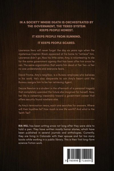 In a society where death is orchestrated by the government, the Tiered system keeps people honest. It keeps people from running. It keeps people scared. Lawrence Nero will never forget the day six years ago when the mysterious Captain Black appeared at his home to "retrieve" him. Lawrence didn't go. Now his little sister, Amy, is volunteering to die for the same government agency that has been after him since he ran. The same organization that wants him dead at Tier Ten-a Tier no one understands and everyone fears. David Frome, Amy's neighbor, is a Bureau employee who believes in his work. He's also desperate to win Amy's heart-until the Bureau assigns him to be her retrieving Agent. Dezzie Newton is a student in the aftermath of a personal tragedy that completely upended the future she imagined for herself. Now, her life is careening inexorably toward a government career that offers security found nowhere else. As Amy's termination nears, each one searches for answers. Where will their loyalties lie? How much is one life worth? And what is the Tenth Tier?