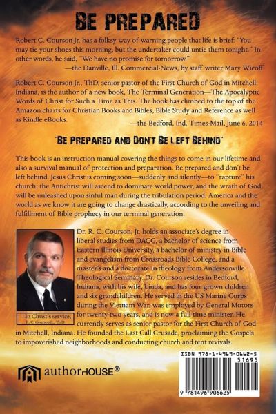 Prior to reading and undertaking the study of this book I want to encourage you to understand we are the Terminal Generation according to the empirical evidence, the scientific evidence and the biblical evidence that will be presented in this book. Simply our generation; the Baby-Boomers, the Hippies, the Yuppies, the Generation X, and the Millennials will be alive when humanities greatest cataclysmic event sounds in our life time. As you read this book realize the world and your life as you know it today is about to change forever! Jesus Christ is coming soon, suddenly, silently to Rapture His Church, the Anti-Christ will ascend to dominate world power and the Wrath of God will be unleashed upon sinful man during the Great Tribulation Period. This book is an instruction manual covering the things to come in our life time and also a survival manual of protection and preparation; be prepared and don't be left behind!