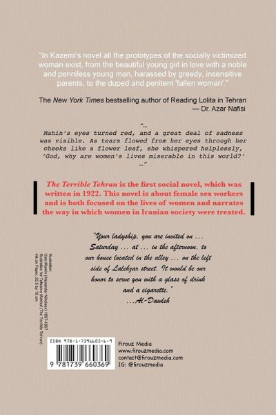 The Terrible Tehran is the first social novel, which was written in 1922. This novel is about female sex workers and is both focused on the lives of women and narrates the way in which women in Iranian society were treated. Following World War One there was a wave of political corruption and signs of decaying morals throughout the country that are depicted within this book. Review:"In Kazemi's novel all the prototypes of the socially victimized woman exist, from the beautiful young girl in love with a noble and penniless young man, harassed by greedy, insensitive parents, to the duped and penitent 'fallen woman'." The New York Times bestselling author of Reading Lolita in Tehran - Dr. Azar Nafisi