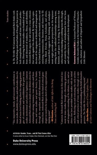 In The Terrible We Cameron Awkward-Rich thinks with the bad feelings and mad habits of thought that persist in both transphobic discourse and trans cultural production. Observing that trans studies was founded on a split from and disavowal of madness, illness, and disability, Awkward-Rich argues for and models a trans criticism that works against this disavowal. By tracing the coproduction of the categories of disabled and transgender in the United States at the turn of the twentieth century and analyzing transmasculine literature and theory by Eli Clare, Elliott DeLine, Dylan Scholinski, and others, Awkward-Rich suggests that thinking with maladjustment might provide new perspectives on the impasses arising from the conflicted relationships among trans, feminist, and queer. In so doing, he demonstrates that rather than only impeding or confining trans life, thought, and creativity, forms of maladjustment have also been and will continue to be central to their development. Duke University Press Scholars of Color First Book Award recipient