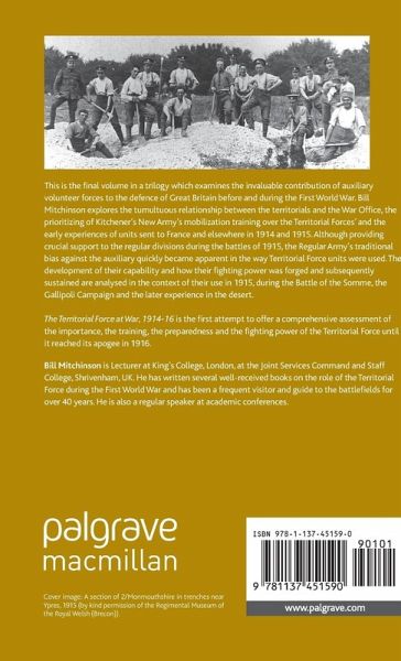 William Mitchinson analyses the role and performance of the Territorial Force during the first two years of World War I. The study looks at the way the force was staffed and commanded, its relationship with the Regular Army and the War Office, and how most of its 1st Line divisions managed to retain and promote their local identities.