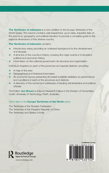 A new addition to Europa's popular 'Territories of the World' series, "The Territories of Indonesia "provides invaluable information on this diverse country. The book supplies an in-depth guide to both the regional dimensions of the area and its inter-provincial politics. * Informative introductory essays provide an impartial background on regional aspects of the Republic * A chronology covers the major events in the area's political and economic history including: colonial rule, independence, guided democracy, Suharto and recent terrorist activities * Information is provided about the national governments, structures and organizations Individual chapters on each of the provinces and special districts, providing: * A map of the area, with geographical and historical information * An economic survey presenting the latest available statistics on performance and conditions in each of the provinces and districts * A directory of the names and addresses of leading administrative and political officials This key publication offers a unique insight into the struggle between provinces and central government within Indonesia.