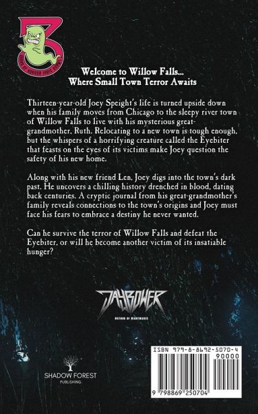 Welcome to Willow Falls-Where Small Town Terror Awaits Thirteen-year-old Joey Speight's life is turned upside down when his family moves from Chicago to the sleepy river town of Willow Falls to live with his mysterious great-grandmother, Ruth. Relocating to a new town is tough enough, but the whispers of a horrifying creature called the Eyebiter that feasts on the eyes of its victims make Joey question the safety of his new home. Along with his new friend Len, Joey digs into the town's dark past. He uncovers a chilling history drenched in blood, dating back centuries. A cryptic journal from his great-grandmother's family reveals connections to the town's origins and Joey must face his fears to embrace a destiny he never wanted. Can he survive the terror of Willow Falls and defeat the Eyebiter, or will he become another victim of its insatiable hunger? Fans of atmospheric horror, gruesome folklore, and relentless suspense won't want to miss The Terror of Willow Falls.
