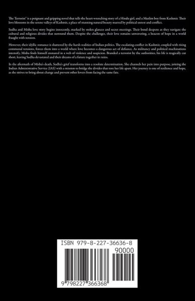 The Terrorist" is a poignant and gripping novel that tells the heart-wrenching story of a Hindu girl, and a Muslim boy from Kashmir. Their love blossoms in the serene valleys of Kashmir, a place of stunning natural beauty marred by political unrest and conflict. Sudha and Misba love story begins innocently, marked by stolen glances and secret meetings. Their bond deepens as they navigate the cultural and religious divides that surround them. Despite the challenges, their love remains unwavering, a beacon of hope in a world fraught with tension. However, their idyllic romance is shattered by the harsh realities of Indian politics. The escalating conflict in Kashmir, coupled with rising communal tensions, forces them into a world where love becomes a dangerous act of defiance. As militancy and political machinations intensify, Misba finds himself ensnared in a web of violence and suspicion. Branded a terrorist by the authorities, his life is tragically cut short, leaving Sudha devastated and their dreams of a future together in ruins. In the aftermath of Misba's death, Sudha's grief transforms into a resolute determination. She channels her pain into purpose, joining the Indian Administrative Service (IAS) with a mission to bridge the divides that tore her life apart. Her journey is one of resilience and hope, as she strives to bring about change and prevent other lovers from facing the same fate.