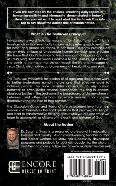 If you are bothered by the endless, unnerving daily reports of human insensitivity and inhumanity demonstrated in today’s culture, then you will want to read what The Teshuvah Principle has to say about the darker side of human nature. What is The Teshuvah Principle? In Hebrew, the word teshuvah means to "turn" or to "change." It is this transformation that eventually inclines us to prefer good to evil, love for hate, and peace for chaos. In her book, Dr. Shaw provides an unvarnished critique of undesirable human behavior and provides the hope that God’s transformative power can change us and turn us (teshuvah) from the world’s darkness to the spiritual light of love. She points to the hope that shines through the life and messages of Jesus Christ, which drives us to a renewal of heart, mind, and soul. The Teshuvah Principle is for readers of all ages and stages who want to better understand human nature and find effective ways to achieve peace. The book provides answers as to why human behavior so often defies rational explanation, resulting in endless, disastrous battles in the bedroom, the boardroom, and everywhere in between, and offers methods by which readers can improve themselves and the lives of their families. The Discussion Guide and Personal Life Assessment Inventory help readers ask themselves the hard questions that provoke, challenge, and lead to transformative thinking about who we are and what we hope to accomplish as citizens of the earth and children of God.