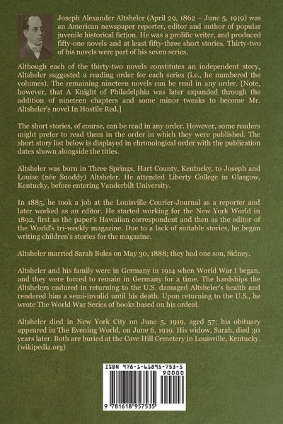 Joseph Alexander Altsheler (April 29, 1862 - June 5, 1919) was an American newspaper reporter, editor and author of popular juvenile historical fiction. He was a prolific writer, and produced fifty-one novels and at least fifty-three short stories. Thirty-two of his novels were part of his seven series. Although each of the thirty-two novels constitutes an independent story, Altsheler suggested a reading order for each series (i.e., he numbered the volumes). The remaining nineteen novels can be read in any order. [Note, however, that A Knight of Philadelphia was later expanded through the addition of nineteen chapters and some minor tweaks to become Mr. Altsheler's novel In Hostile Red.] The short stories, of course, can be read in any order. However, some readers might prefer to read them in the order in which they were published. The short story list below is displayed in chronological order with the publication dates shown alongside the titles. Altsheler was born in Three Springs, Hart County, Kentucky, to Joseph and Louise (née Snoddy) Altsheler. He attended Liberty College in Glasgow, Kentucky, before entering Vanderbilt University. In 1885, he took a job at the Louisville Courier-Journal as a reporter and later worked as an editor. He started working for the New York World in 1892, first as the paper's Hawaiian correspondent and then as the editor of the World's tri-weekly magazine. Due to a lack of suitable stories, he began writing children's stories for the magazine. Altsheler married Sarah Boles on May 30, 1888; they had one son, Sidney. Altsheler and his family were in Germany in 1914 when World War I began, and they were forced to remain in Germany for a time. The hardships the Altshelers endured in returning to the U.S. damaged Altsheler's health and rendered him a semi-invalid until his death. Upon returning to the U.S., he wrote The World War Series of books based on his ordeal. Altsheler died in New York City on June 5, 1919, aged 57; his obituary appeared in The Evening World, on June 6, 1919. His widow, Sarah, died 30 years later. Both are buried at the Cave Hill Cemetery in Louisville, Kentucky. (wikipedia.org)