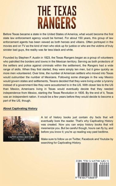 If you want to discover the captivating history of the Texas Rangers, then keep reading... Before Texas became a state in the United States of America, what would become the first state law enforcement agency would be formed. For about 150 years, this group of law enforcement agents has been viewed as both heroes and villains. Often portrayed in the movies and on TV as the kind of men who stick up for justice or who are the victims of truly sinister bad guys, the reality was far less black and white. Founded by Stephen F. Austin in 1823, the Texas Rangers began as a group of volunteers who patrolled the borders and towns in the Mexican territory. Serving as both protectors of the settlers and police against criminals within the settlement, the Rangers had a wide range of skills. When they first started, they were simply ten men, but it grew quickly as more men volunteered. Over time, the number of American settlers who moved into Texas would outnumber the number of Mexicans. Following some changes in the way Mexico would govern states and settlements, Texans decided that they were living under a tyranny instead of a government like they were accustomed to in the US. In The Texas Rangers: A Captivating Guide to the History of a Law Enforcement Agency That Has Helped Stop Some of America's Most Infamous Criminals and Their Role in the Mexican-American War, you will discover topics such as Stephen Austin and the Founding of the Texas Rangers Growing Discontentment in Texas and the War for Texas Independence Protecting New Settlers after the Revolution Driving the Natives from Their Homes The Annexation of Texas The Mexican-American War Corruption, Loss of Popularity, Rebuilding and Restoring an Earlier Image The Fence Cutting Wars The Injustice Perpetrated by the Texas Rangers Some of the More Notable Texas Rangers Sam Bass John Wesley Hardin The Assassination Attempt Role in the Bandit War Taking Down Bonnie and Clyde The Murder of Irene Garza Their Role Today And much, much more!