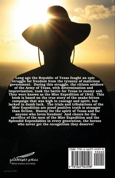 Long ago the Nation of the Republic of Texas, fought an epic struggle for freedom from the tyranny of malicious government. During this struggle, the citizen soldiers of Texas, with determination and improvisation , took the battle for Texas to enemy soil. Their struggle was known as the Mier Expedition. This book is based on the true story of the snake-bitten war campaign the was high in courage, and spirit, but lacked in luck. The trials and tribulations of the Mier Expedition were extraordinary! Hooray for the Spirit of TEXAS! And for the Spirit of the Lord! that is the spark of freedom in everyone! Cheers! for the sacrifice, of the men, of the Mier Expedition and the Splendid Expendables of every generation, the heroes of the race of people known as the Decent! Who never get the recognition they deserve!