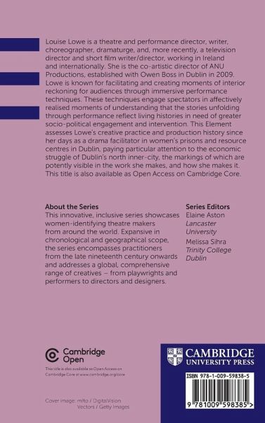 Louise Lowe is a theatre and performance director, writer, choreographer, dramaturge, and, more recently, a television director and short film writer/director, working in Ireland and internationally. She is the Co-Artistic Director of ANU Productions, established with Owen Boss in Dublin in 2009. Lowe is known for facilitating and creating moments of interior reckoning for audiences through immersive performance techniques. These techniques engage spectators in affectively realised moments of understanding that the stories unfolding through performance reflect living histories in need of greater socio-political engagement and intervention. This Element assesses Lowe's creative practice and production history since her days as a drama facilitator in women's prisons and resource centres in Dublin, paying particular attention to the economic struggle of Dublin's north inner-city, the markings of which are potently visible in the work she makes, and how she makes it. This title is also available as Open Access on Cambridge Core.