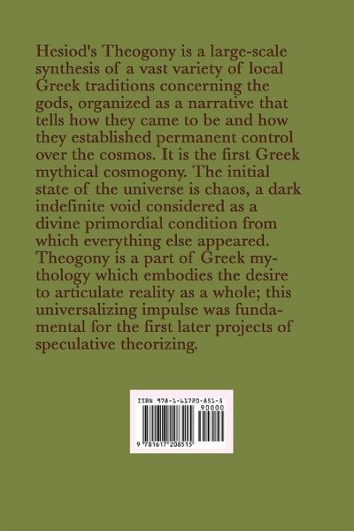 Hesiod's Theogony is a large-scale synthesis of a vast variety of local Greek traditions concerning the gods, organized as a narrative that tells how they came to be and how they established permanent control over the cosmos. It is the first Greek mythical cosmogony. The initial state of the universe is chaos, a dark indefinite void considered as a divine primordial condition from which everything else appeared. Theogony is a part of Greek mythology which embodies the desire to articulate reality as a whole; this universalizing impulse was fundamental for the first later projects of speculative theorizing.