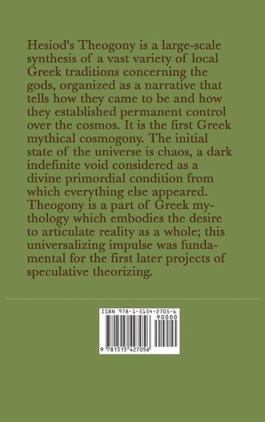 Hesiod's Theogony is a large-scale synthesis of a vast variety of local Greek traditions concerning the gods, organized as a narrative that tells how they came to be and how they established permanent control over the cosmos. It is the first Greek mythical cosmogony. The initial state of the universe is chaos, a dark indefinite void considered as a divine primordial condition from which everything else appeared. Theogony is a part of Greek mythology which embodies the desire to articulate reality as a whole; this universalizing impulse was fundamental for the first later projects of speculative theorizing.