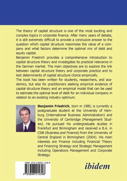 The theory of capital structure is one of the most exciting and complex topics in corporate finance. After many years of debate it is still extremely difficult to provide a conclusive answer to the question which capital structure maximises the value of a company and what factors determine the optimal mix of debt and equity capital.This book provides a comprehensive introduction to capital structure theory and investigates its practical relevance in the German market. The main objectives are to explore the link between capital structure theory and corporate practice and to test determinants of capital structure choice empirically.The book has been written for students, researchers, and academics, but also for practitioners seeking empirical evidence of capital structure theory and an empirical model that can be used to estimate the optimal level of debt for an individual company in relation to an existing industry optimum.