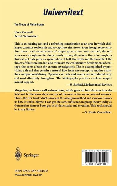 From the reviews: H. Kurzweil and B. Stellmacher The Theory of Finite Groups An Introduction "An exciting and refreshing contribution to an area in which challenges continue to flourish and to captivate the viewer. The text serves as a springboard for deeper study in many directions. One who completes this text not only gains an appreciation of both the depth and the breadth of the theory of finite groups, but also witnesses the evolutionary development of concepts that form a basis for current investigations." -MATHEMATICAL REVIEWS "The book under review is incontrovertible proof that the theory of finite groups per se is alive and well too. ... is also a marvelous treatment of a large chunk of what is going on today. ... There are a lot of nice exercises, the scholarship is phenomenally thorough ... . The entire presentation is quite elegant. ... If I, personally, should wish to learn a lot of serious finite group theory I'd go with this book ... ." (Michael Berg, MathDL The MAA Mathematical Sciences Digital Library, July, 2004) "This book is a tour de force. In the space of 387 pages, it takes the reader from the definition of a group ... developing and illustrating many of the deepest techniques which have been deployed in the analysis of finite simple groups. ... It is also fascinating reading for anyone interested in getting an excellent introduction to a wide spectrum of ideas and methods, many originating in Thompson's N-group papers, which played a critical role in the original proof of the classification theorem." (Ronald Solomon, SIAM Reviews, Vol. 47 (4), 2005) "This is the English translation of the book 'Theorie der endlichen Gruppen' (1998), which has met warmest reception and has been reviewed enthusiastically. ... a book which gives a deep insight into the modern theory of finite groups." (G.Kowol, Monatshefte für Mathematik, Vol. 146 (2), 2005) "This valuable text is a welcome translation of the highly-regarded German version ... . As a whole this book is carefully constructed and shows all the hallmarks of having been honed over a number of years so that the necessary concepts are all in place when needed, and the development unfolds in a fluent manner. ... This is a book which every serious student of finite groups will want to own, and one which makes a highly significant contribution to the discipline." (Robert T. Curtis, The Mathematical Gazette, Vol. 89 (515), 2005)
