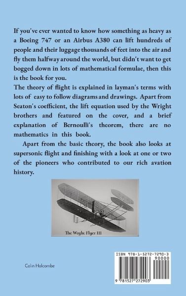 If you've ever wanted to know how something as heavy as a Boeing 747 or an Airbus A380 can lift hundreds of people and their luggage thousands of feet into the air and fly them halfway around the world, but didn't want to get bogged down in lots of mathematical formulae, then this is the book for you. The theory of flight is explained in layman's terms with lots of easy to follow diagrams and drawings. Apart from Seaton's coefficient, the lift equation used by the Wright brothers and featured on the cover, and a brief explanation of Bernoulli's theorem, there are no mathematics in this book. Apart from the basic theory, the book also looks at supersonic flight and finishing with a look at one or two of the pioneers who contributed to our rich avation history.