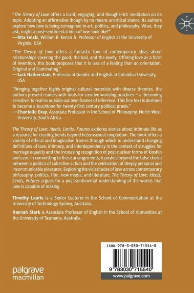 The Theory of Love: Ideals, Limits, Futures explores stories about love that recuperate a vision of intimate life as a resource for creating bonds beyond heterosexual coupledom. This book offers a variety of ethical frames through which to understand changing definitions of love, intimacy, and interdependency in the context of struggles for marriage equality and the increasing recognition of post-nuclear forms of kinship and care. It commits to these post-nuclear arrangements, while pushing beyond the false choice between a politics of collective action and the celebration of deeply personal and incommunicable pleasures. In exploring the vicissitudes of love across contemporary philosophy, politics, film, new media, and literature, The Theory of Love: Ideals, Limits, Futures develops an original post-sentimental concept of love as a way to explain emergent intimacies and affiliations beyond the binary couple.