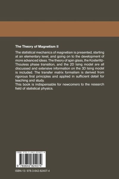 1. Introduction and Guide to This Text.- 2. Statistical Thermodynamics.- 2.1 Spins in a Magnetic Field.- 2.2 The Partition Function.- 2.3 The Concept of the Molecular Field.- 2.4 Discontinuity in Specific Heat.- 2.5 Magnetic Susceptibility and Spontaneous Magnetization.- 2.6 Antiferromagnetism.- 2.7 Short-Ranged Versus Long-Ranged Interactions.- 2.8 Fermions, Bosons, and All That.- 2.9 Gaussian and Spherical Models.- 2.10 Magnetic Susceptibility in Gaussian and Spherical Models.- 2.11 Spherical Antiferromagnet.- 2.12 Spherical Model Spin Glass.- 2.13 Magnetic Properties of Spin Glass.- 2.14 Thermodynamics of Magnons.- 2.15 Magnetism in Two Dimensions.- 2.16 The XY Mode1:1D.- 2.17 The XY Model:2D.- 2.18 Transfer Matrix of Plane Rotator Model.- 3. The Ising Model.- 3.1 High Temperature Expansions.- 3.2 Graph Theory.- 3.3 Low Temperature Expansions and the Duality Relations.- 3.4 Peierls' Proof of Long Range Order.- 3.5 1D Ising Model in Longitudinal Fields.- 3.6 1D Ising Model in Transverse Fields.- 3.7 Concerning Quadratic Forms of Fermion Operators.- 3.8 Two-Dimensional Ising Model: The Transfer Matrix.- 3.9 Solution of Two-Dimensional Ising Model in Zero Field.- 3.10 Spontaneous Magnetization and Magnetic Susceptibility.- 3.11 Zeros of the Partition Function.- 3.12 Miscellania, Including 2D Antiferromagnets.- 3.13 The Three-Dimensional Ising Model.- References.- List of Tables.- Errata for The Theory of Magnetism I (Springer Series in Solid-State Sciences, Vol. 17).