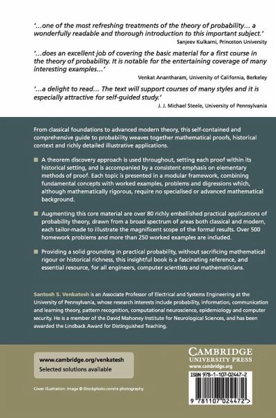 From classical foundations to advanced modern theory, this self-contained and comprehensive guide to probability weaves together mathematical proofs, historical context and richly detailed illustrative applications. A theorem discovery approach is used throughout, setting each proof within its historical setting and is accompanied by a consistent emphasis on elementary methods of proof. Each topic is presented in a modular framework, combining fundamental concepts with worked examples, problems and digressions which, although mathematically rigorous, require no specialised or advanced mathematical background. Augmenting this core material are over 80 richly embellished practical applications of probability theory, drawn from a broad spectrum of areas both classical and modern, each tailor-made to illustrate the magnificent scope of the formal results. Providing a solid grounding in practical probability, without sacrificing mathematical rigour or historical richness, this insightful book is a fascinating reference and essential resource, for all engineers, computer scientists and mathematicians.