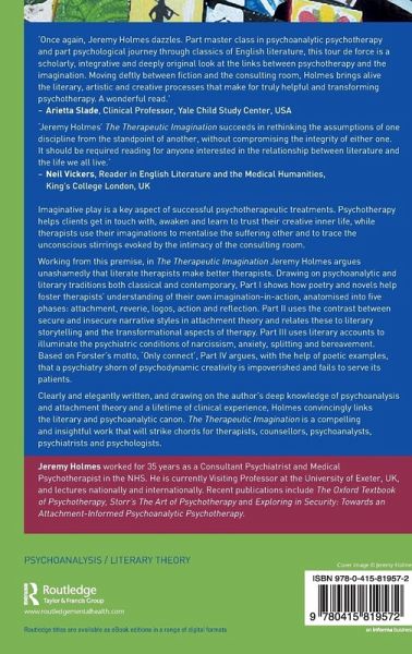 Use of the imagination is a key aspect of successful psychotherapeutic treatments. Psychotherapy helps clients get in touch with, awaken, and learn to trust their creative inner life, while therapists use their imaginations to mentalise the suffering other and to trace the unconscious stirrings evoked by the intimacy of the consulting room. Working from this premise, in The Therapeutic Imagination Jeremy Holmes argues unashamedly that literate therapists make better therapists. Drawing on psychoanalytic and literary traditions both classical and contemporary, Part I shows how poetry and novels help foster therapists' understanding of their own imagination-in-action, anatomised into five phases: attachment, reverie, logos, action and reflection. Part II uses the contrast between secure and insecure narrative styles in attachment theory and relates these to literary storytelling and the transformational aspects of therapy. Part III uses literary accounts to illuminate the psychiatric conditions of narcissism, anxiety, splitting and bereavement. Based on Forster's motto, 'Only Connect', Part IV argues, with the help of poetic examples, that a psychiatry shorn of psychodynamic creativity is impoverished and fails to serve its patients. Clearly and elegantly written, and drawing on the author's deep knowledge of psychoanalysis and attachment theory and a lifetime of clinical experience, Holmes convincingly links the literary and psychoanalytic canon. The Therapeutic Imagination is a compelling and insightful work that will strike chords for therapists, counsellors, psychoanalysts, psychiatrists and psychologists.