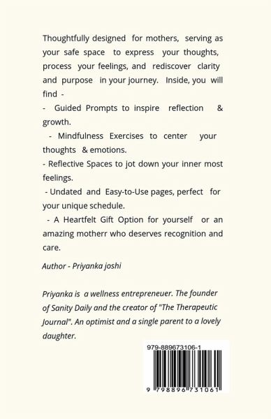 The Therapeutic Journal - a guided self-care journal for mothers. Being a mother is a beautiful, yet demanding journey that often leaves little room for self-care. The Therapeutic Journal for Mothers is here to change that. Specially designed for mothers, this first edition offers a space for reflection, mindfulness, and emotional nourishment amidst the chaos of daily life. Inside the journal, you will find - - Guided Prompts to process your emotions and find clarity - Mindfulness Exercises to help you breathe, relax, and stay grounded - Reflective Spaces to nurture your emotional well-being - Undated and Easy-to-Use pages, perfect for your unique schedule. - A Heartfelt Gift Option for yourself or another amazing mom who deserves recognition and care. All it takes is 10 minutes a day to embrace your much-needed "Me Time." Let this journal be your companion, offering you a safe space to express, heal, and reconnect with your inner self. Why Choose The Therapeutic Journal? ✔ Designed specifically to support moms' mental health ✔ Perfect for managing stress, processing emotions, and finding calm ✔ A thoughtful, guided approach to self-care Grab your copy today and start your journey toward emotional well-being!