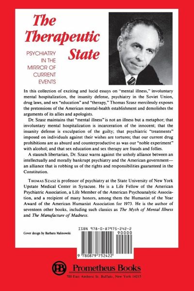 Thomas Szasz has been challenging the very existence of "mental illness" for over twenty-five years. His advocacy of freedom of choice and the abolition of involuntary psychiatry has made him America's most controversial psychiatrist. The Therapeutic State is a unique collection of topical essays about what the author calls "one of the grandest illusions of our age, mental illness, and the quixotic crusade against it." Pivoting his analysis on news-making events, Szasz exposes the fallacies of our present penchant for interpreting the behavior of "sane" persons as goal-directed and therefore sensible, and the behavior of "insane" persons as caused by a "mental illness" and therefore senseless. In a series of diverse short pieces, originally published in newspapers and magazines, the author shows us that individual liberty and responsibility are indivisible, and that we cannot protect ourselves against coercive psychiatry's threats to liberty so long as we persist in using psychiatric ideas and interventions to evade responsibility. Szasz's recommendation is simple but radical: So-called mental patients should be treated like other people - as no more subject to loss of liberty or entitled to excuses from responsibility than anyone else. Psychiatrists should be treated like other professionals - having no more power to inculpate innocent persons or to expurgate guilty ones than, say, accountants or architects. In short, our aim should be to disarm psychiatrists, much as the Founding Fathers disarmed priests. Nothing less can free us from the "benefits" and "harms" of the Therapeutic State.