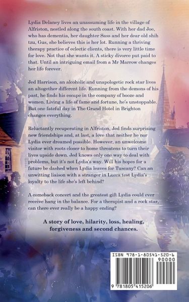 Lydia Delaney lives an unassuming life in the village of Alfriston, nestled along the south coast. With her dad Joe, who has dementia, her daughter Sass and her dear old shih tzu, Gus, she believes this is her lot. Running a thriving therapy practice of eclectic clients, there is very little time for love. Not that she wants it. A sticky divorce put paid to that. Until an intriguing email from a Mr Marrow changes her life forever. Jed Harrison, an alcoholic and unapologetic rock star lives an altogether different life. Running from the demons of his past, he finds his escape in the company of booze and women. Living a life of fame and fortune, he's unstoppable. But one fateful day in The Grand Hotel in Brighton changes everything. Reluctantly recuperating in Alfriston, Jed finds surprising new friendships and, at last, a love that neither he nor Lydia ever dreamed possible. However, an unwelcome visitor with roots closer to home threatens to turn their lives upside down. Jed knows only one way to deal with problems, but it's not Lydia's way. Will his hopes for a future be dashed when Lydia leaves for Tuscany? Can an unwitting liaison with a stranger in Lucca test Lydia's loyalty to the life she's left behind? A comeback concert and the greatest gift Lydia could ever receive hang in the balance. For a therapist and a rock star, can there ever really be a happy ending? A story of love, hilarity, loss, healing, forgiveness and second chances.