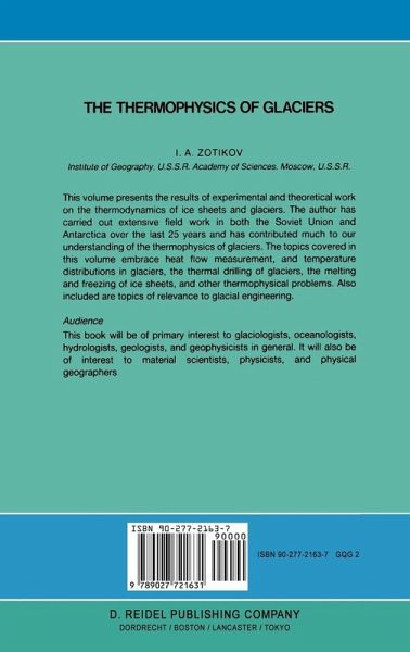 1: Observations of the Thermal Regime of Glaciers.- 1.1. Measurements of Temperatures Inside Glaciers.- 1.2. Sources of Errors During Temperature Measurements in Glacier Boreholes.- 2: Thermal Drilling of Glaciers.- 2.1. The Theory of Drilling by Contact with a Heated Solid Surface.- 2.2. Methods of Thermal Drilling of Ice.- 2.3. Antifreeze Thermal Drilling by Direct Contact with a Solid Heater.- 3: The Theory of the Thermal Regime of Glaciers.- 3.1. The Fundamental Equations and Conditions Describing the State of a Glacier.- 3.2. Equations of Motion of Viscoplastic Ice.- 3.3. Internal Heat Sources Created by Ice Motion.- 3.4. Uniqueness Conditions.- 3.5. Simplifying the Equations. Dimensionless Numbers..- 4: The Temperature Field in a Flat Two-Dimensional Glacier With Block Sliding.- 4.1. A General Expression for the Temperature Field. Kinematics of a Glacier..- 4.2. Accurate Solutions for the Temperature Field.- 4.3. Mean Temperature of a Glacier.- 4.4. Temperature Gradients in the Glacier Interior.- 4.5. The Effect of the Dissipation Function.- 5: Approximate Methods for Studying the Temperature Field in a Flat Two-Dimensional Glacier With Block Sliding.- 5.1. The Method of Polynomials.- 5.2. The Temperature Field in a Glacier with a Varying Surface Temperature.- 6: The Thermal Regime of Glaciers.- 6.1. Thermophysical Studies of Accumulation-Ablation at the Upper and Lower Surfaces of Glaciers.- 6.2. Boundary Conditions at the Lower Surface of an Inland Glacier.- 6.3. Heat Sources Participating in the Heat Balance at the Bottom of a Glacier.- 7: The Thermal Regime of Inland Ice Caps.- 7.1. The Thermal Regime of the Antarctic Ice Sheet.- 7.2. Numerical Modeling of the Temperature Field of an Ice Cap.- 8: The Thermal Regime of Mountain Glaciers.- 8.1. The Melting of aContaminated Glacier Surface.- 8.2. Water in Mountain Glaciers.- 9: The Thermophysics of Ice Shelves.- 9.1. Melting at the Bottom of an Ice Shelf.- 9.2. Freezing at the Bottom of an Ice Shelf.- 9.3. Thermophysical Studies of Melting and Freezing at the Bottom of the Ross Ice Shelf.- 10: Applications of the Thermophysics of Glaciers.- 10.1. The Thermal Pollution of Ice Caps with Heat-Emitting Industrial Wastes.- 10.2. Reconstruction of the Quaternary Inland Ice Sheet of Europe.- References.