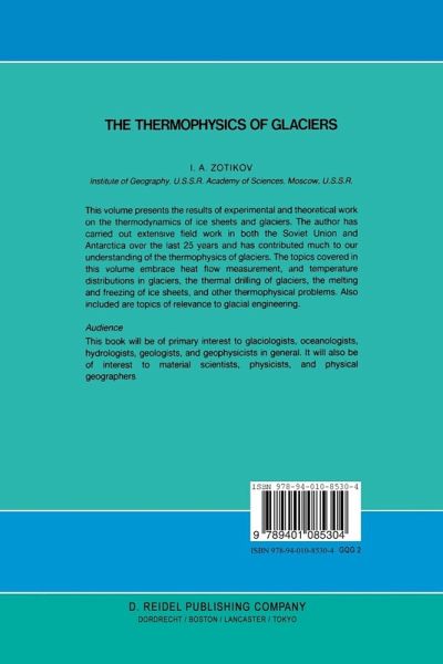 1: Observations of the Thermal Regime of Glaciers.- 1.1. Measurements of Temperatures Inside Glaciers.- 1.2. Sources of Errors During Temperature Measurements in Glacier Boreholes.- 2: Thermal Drilling of Glaciers.- 2.1. The Theory of Drilling by Contact with a Heated Solid Surface.- 2.2. Methods of Thermal Drilling of Ice.- 2.3. Antifreeze Thermal Drilling by Direct Contact with a Solid Heater.- 3: The Theory of the Thermal Regime of Glaciers.- 3.1. The Fundamental Equations and Conditions Describing the State of a Glacier.- 3.2. Equations of Motion of Viscoplastic Ice.- 3.3. Internal Heat Sources Created by Ice Motion.- 3.4. Uniqueness Conditions.- 3.5. Simplifying the Equations. Dimensionless Numbers..- 4: The Temperature Field in a Flat Two-Dimensional Glacier With Block Sliding.- 4.1. A General Expression for the Temperature Field. Kinematics of a Glacier..- 4.2. Accurate Solutions for the Temperature Field.- 4.3. Mean Temperature of a Glacier.- 4.4. Temperature Gradients in the Glacier Interior.- 4.5. The Effect of the Dissipation Function.- 5: Approximate Methods for Studying the Temperature Field in a Flat Two-Dimensional Glacier With Block Sliding.- 5.1. The Method of Polynomials.- 5.2. The Temperature Field in a Glacier with a Varying Surface Temperature.- 6: The Thermal Regime of Glaciers.- 6.1. Thermophysical Studies of Accumulation-Ablation at the Upper and Lower Surfaces of Glaciers.- 6.2. Boundary Conditions at the Lower Surface of an Inland Glacier.- 6.3. Heat Sources Participating in the Heat Balance at the Bottom of a Glacier.- 7: The Thermal Regime of Inland Ice Caps.- 7.1. The Thermal Regime of the Antarctic Ice Sheet.- 7.2. Numerical Modeling of the Temperature Field of an Ice Cap.- 8: The Thermal Regime of Mountain Glaciers.- 8.1. The Melting of aContaminated Glacier Surface.- 8.2. Water in Mountain Glaciers.- 9: The Thermophysics of Ice Shelves.- 9.1. Melting at the Bottom of an Ice Shelf.- 9.2. Freezing at the Bottom of an Ice Shelf.- 9.3. Thermophysical Studies of Melting and Freezing at the Bottom of the Ross Ice Shelf.- 10: Applications of the Thermophysics of Glaciers.- 10.1. The Thermal Pollution of Ice Caps with Heat-Emitting Industrial Wastes.- 10.2. Reconstruction of the Quaternary Inland Ice Sheet of Europe.- References.