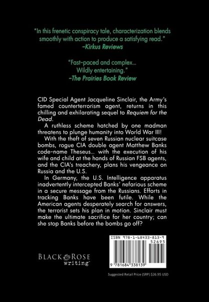 2021 Finalist, The Best Thriller Book Awards on BestThrillers.com "The writing packs all the punches of a Tom Clancy-esque coldwar nail-biter with a modern edge." -Hollywood Book Reviews CID Special Agent Jacqueline Sinclair, the Army's famed counterterrorism agent, returns in this chilling and exhilarating sequel to Requiem for the Dead. A ruthless scheme hatched by one madman threatens to plunge humanity into World War III! With the theft of seven Russian nuclear suitcase bombs, rogue CIA double agent Matthew Banks code-name Theseus... with the execution of his wife and child at the hands of Russian FSB agents, and the CIA's treachery, plans his vengeance on Russia and the U.S. In Germany, the U.S. Intelligence apparatus inadvertently intercepted Banks' nefarious scheme in a secure message from the Russians. Efforts in tracking Banks have been futile. While the American agents desperately search for answers, the terrorist sets his plan in motion. Sinclair must make the ultimate sacrifice for her country; can she stop Banks before the bombs go off?