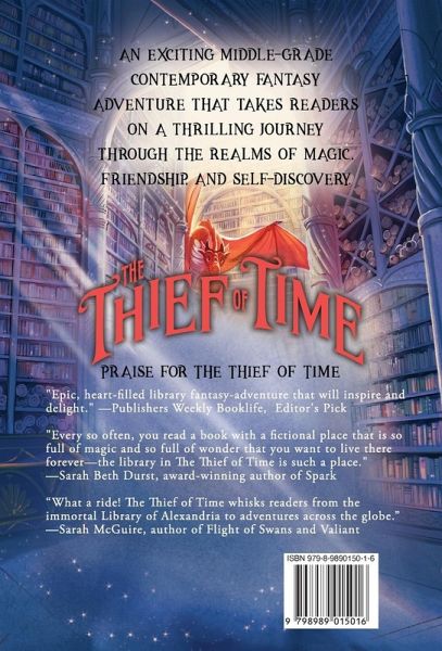 "The Thief of Time is a thrilling contemporary fantasy that will steal your breath away. Chock full of complex world building and magic that springs from the power of story, this book will definitely keep young readers turning pages."-Polly Holyoke, award-winning author Unleash the Magic... THE THIEF OF TIME is an exciting middle-grade contemporary fantasy adventure that takes readers on a thrilling journey through the realms of magic, friendship, and self-discovery. On a visit to their local library, Ben, Bridgette, and Maya unwittingly unleash a dragon from an ancient book and find themselves fighting for their lives against a swarm of evil birds. They battle to escape with the help of the dragon and are whisked through a portal into the magical Great Library of Alexandria. Once they pass the Trials and prove themselves worthy, they are invited to become students at Helicon Academy. There they train to become librarians for the Library of Alexandria, protecting books and the magical artifacts within. Ben, Bridgette, and Maya fall in love with the story-themed dinners, fantastical animals, and fictional characters roaming the halls. But when they discover a dark and sinister mystery within the academy's halls, the three must embark on a quest to protect the library and preserve the fabric of time itself.