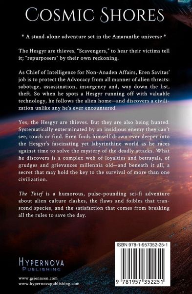 * A stand-alone adventure set in the Amaranthe universe * The Hesgyr are thieves. "Scavengers," to hear their victims tell it; "repurposers" by their own reckoning. As Chief of Intelligence for Non-Anaden Affairs, Eren Savitas' job is to protect the Advocacy from all manner of alien threats: sabotage, assassination, insurgency and, way down the list, theft. So when he spots a Hesgyr running off with valuable technology, he follows the alien home-and discovers a civilization unlike any he's ever encountered. Yes, the Hesgyr are thieves. But they are also being hunted. Systematically exterminated by an insidious enemy they can't see, touch or find. Eren finds himself drawn ever deeper into the Hesgyr's fascinating yet labyrinthine world as he races against time to solve the mystery of the deadly attacks. What he discovers is a complex web of loyalties and betrayals, of grudges and grievances millennia old-and beneath it all, a secret that may hold the key to the survival of more than one civilization. The Thief is a humorous, pulse-pounding sci-fi adventure about alien culture clashes, the flaws and foibles that transcend species, and the satisfaction that comes from breaking all the rules to save the day.