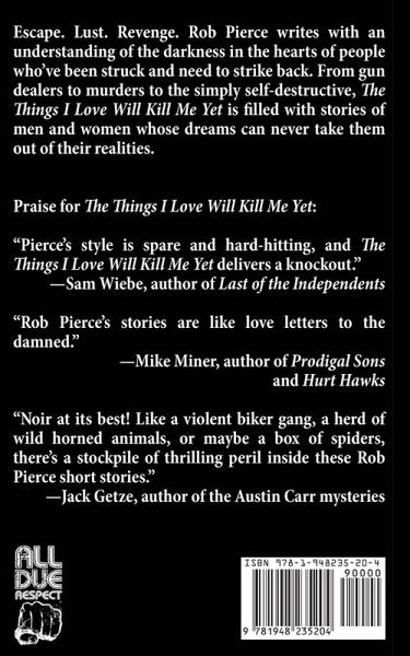 Escape. Lust. Revenge. Rob Pierce writes with an understanding of the darkness in the hearts of people who’ve been struck and need to strike back. From gun dealers to murders to the simply self-destructive, The Things I Love Will Kill Me Yet is filled with stories of men and women whose dreams can never take them out of their realities. Praise for THE THINGS I LOVE WILL KILL ME YET: "Pierce’s style is spare and hard-hitting, and The Things I Love Will Kill Me Yet delivers a knockout." —Sam Wiebe, author of Last of the Independents "Rob Pierce’s stories are like love letters to the damned." —Mike Miner, author of Prodigal Sons and Hurt Hawks "Noir at its best! Like a violent biker gang, a herd of wild horned animals, or maybe a box of spiders, there’s a stockpile of thrilling peril inside these Rob Pierce short stories." —Jack Getze, author of the Austin Carr mysteries