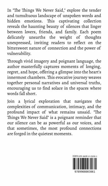 In "The Things We Never Said," explore the tender and tumultuous landscape of unspoken words and hidden emotions. This captivating collection reveals the haunting beauty of silences that linger between lovers, friends, and family. Each poem delicately unearths the weight of thoughts unexpressed, inviting readers to reflect on the bittersweet nature of connection and the power of vulnerability. Through vivid imagery and poignant language, the author masterfully captures moments of longing, regret, and hope, offering a glimpse into the heart's innermost chambers. This evocative journey weaves together personal narratives and universal truths, encouraging us to find solace in the spaces where words fall short. Join a lyrical exploration that navigates the complexities of communication, intimacy, and the profound impact of what remains unsaid. "The Things We Never Said" is a poignant reminder that our silence can be as powerful as our voices, and that sometimes, the most profound connections are forged in the quietest moments.