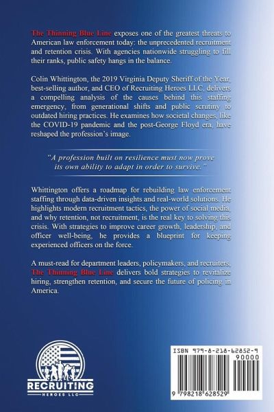 "A profession built on resilience must now prove its own ability to adapt in order to survive." The Thinning Blue Line exposes one of the greatest threats to American law enforcement today: the unprecedented recruitment and retention crisis. With agencies nationwide struggling to fill their ranks, public safety hangs in the balance. Colin Whittington, the 2019 Virginia Deputy Sheriff of the Year, best-selling author, and CEO of Recruiting Heroes LLC, delivers a compelling analysis of the causes behind this staffing emergency, from generational shifts and public scrutiny to outdated hiring practices. He examines how societal changes, like the COVID-19 pandemic and the post-George Floyd era, have reshaped the profession's image. Whittington offers a roadmap for rebuilding law enforcement staffing through data-driven insights and real-world solutions. He highlights modern recruitment tactics, the power of social media, and why retention, not recruitment, is the real key to solving this crisis. With strategies to improve career growth, leadership, and officer well-being, he provides a blueprint for keeping experienced officers on the force. A must-read for department leaders, policymakers, recruiters, and all those who support our men and women in uniform, The Thinning Blue Line delivers bold strategies to revitalize hiring, strengthen retention, and secure the future of policing in America.