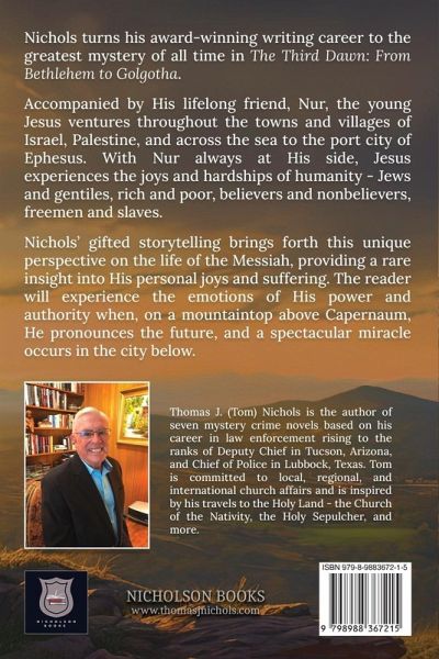 Nichols turns his award-winning writing career to the greatest mystery of all time in The Third Dawn: The Dawn that Changed the World. Accompanied by His lifelong friend, Nur, the young Jesus ventures throughout the towns and villages of Israel, Palestine, and across the sea to the port city of Ephesus. With Nur always at His side, Jesus experiences the joys and hardships of humanity-Jews and gentiles, rich and poor, believers and nonbelievers, freemen and slaves. Nichols' gifted storytelling brings forth this unique perspective on the life of the Messiah, providing a rare insight into His personal joys and suffering. The reader will experience the emotions of His power and authority when, on a mountaintop above Capernaum, He pronounces the future, and a spectacular miracle occurs in the city below. The Third Dawn was initially published in 2011 but is now updated with new dialogueand more detailed settings.
