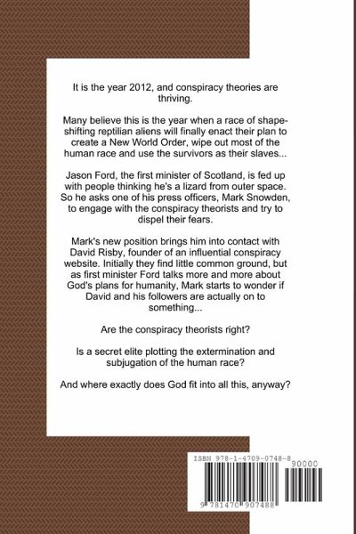 It is the year 2012, and conspiracy theories are thriving. Many believe this is the year when a race of shape-shifting reptilian aliens will finally enact their plan to create a New World Order, wipe out most of the human race and use the survivors as their slaves... Jason Ford, the first minister of Scotland, is fed up with people thinking he's a lizard from outer space. So he asks one of his press officers, Mark Snowden, to engage with the conspiracy theorists and try to dispel their fears. Mark's new position brings him into contact with David Risby, founder of an influential conspiracy website. Initially they find little common ground, but as first minister Ford talks more and more about God's plans for humanity, Mark starts to wonder if David and his followers are actually on to something... Are the conspiracy theorists right? Is a secret elite plotting the extermination and subjugation of the human race? And where exactly does God fit into all this, anyway?