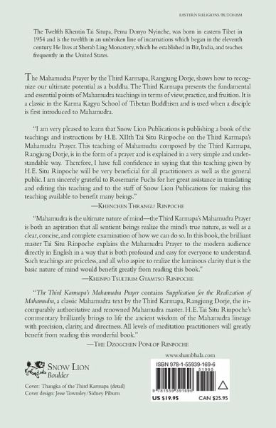 The Mahamudra Prayer by the Third Karmapa Rangjung Dorje is a short yet thorough and profound text which presents all the essential points of Mahamudra teaching in terms of view, practice, and fruition. It is a classic that, especially in the tradition of the Karma Kagyu school of Tibetan Buddhism, has been and is widely used whenever a disciple is given a first introduction into Mahamudra. The Third Karmapa shows how to recognize our ultimate potential as a buddha. The short root text is further explained by Khentin Tai Situpa Pema Donyo Nyingje Wangpo, the twelfth incarnation of the Tai Situpa lineage, which is one of the most important lineages of the Kagyu tradition. His deep understanding of Western culture, especially of the Western psychological perspective, allows him to expound the Dharma with a clarity and directness that is truly inspiring.