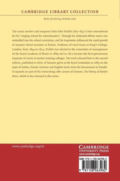 The music teacher and composer John Pyke Hullah (1812-84) is best remembered for his 'singing school for schoolmasters'. Through his dedicated efforts music was embedded into the school curriculum, and his inspiration influenced the rapid growth of amateur choral societies in Britain. Professor of vocal music at King's College, London, from 1844 to 1874, Hullah was elected to the committee of management of the Royal Academy of Music in 1869 and in 1872 became the first government inspector of music in teacher training colleges. The work reissued here is the second edition, published in 1876, of lectures given at the Royal Institution in 1865 on the topic of Italian, French, German and English music from the Renaissance to Handel. It expands on part of his overarching 1861 course of lectures, The History of Modern Music, which is also reissued in this series.