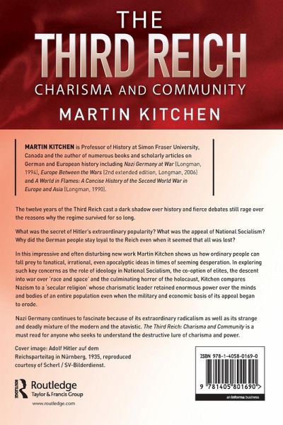 THE THIRD REICH: Charisma and Community Martin Kitchen ISBN: 978-1-4058-0169-0 The twelve years of the Third Reich cast a dark shadow over history and fierce debates still rage over the reasons why the regime survived for so long. What was the secret of Hitler's extraordinary popularity? What was the appeal of National Socialism? Why did the German people stay loyal to the Reich even when it seemed that all was lost? In this impressive and often disturbing new work Martin Kitchen shows us how ordinary people can fall prey to fanatical, irrational, even apocalyptic ideas in times of seeming desperation. In exploring such key concerns as the role of ideology in National Socialism, the cooption of elites, the descent into war over 'race and space' and the culminating horror of the holocaust, Kitchen compares Nazism to a 'secular religion' whose charismatic leader retained enormous power over the minds and bodies of an entire population even when the military and economic basis of its appeal began to erode. Nazi Germany continues to fascinate because of its extraordinary radicalism as well as its strange and deadly mixture of the modern and the atavistic. The Third Reich: Charisma and Community is a must read for anyone who seeks to understand the destructive lure of charisma and power. Martin Kitchen is Professor of History at Simon Fraser University, Canada and the author of numerous books and scholarly articles on German and European history including Nazi Germany at War (Longman, 1994), Europe Between the Wars (2nd extended edition, Longman, 2006) and A World in Flames: A Concise History of the Second World War in Europe and Asia (Longman, 1990).
