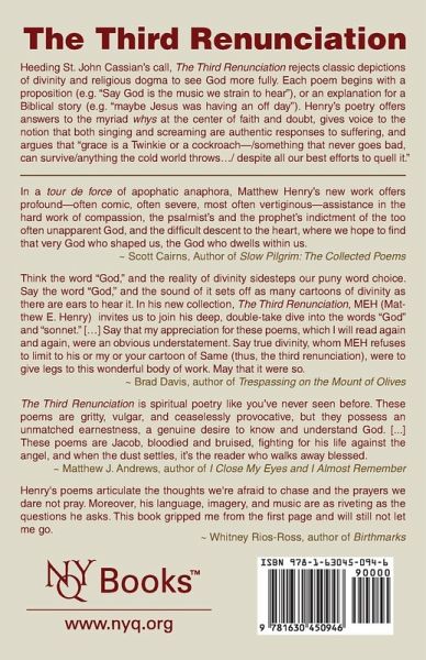 Heeding St. John Cassian's call, The Third Renunciation rejects classic depictions of divinity and religious dogma to see God more fully. Each poem begins with a proposition (e.g. "Say God is the music we strain to hear"), or an explanation for a Biblical story (e.g. "maybe Jesus was having an off day"). Henry's poetry offers answers to the myriad whys at the center of faith and doubt, gives voice to the notion that both singing and screaming are authentic responses to suffering, and argues that "grace is a Twinkie or a cockroach-/something that never goes bad, can survive/anything the cold world throws.../ despite all our best efforts to quell it."