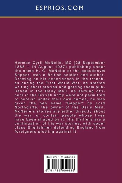Herman Cyril McNeile, MC (28 September 1888 - 14 August 1937) publishing under the name H. C. McNeile or the pseudonym Sapper, was a British soldier and author. Drawing on his experiences in the trenches during the First World War, he started writing short stories and getting them published in the Daily Mail. As serving officers in the British Army were not permitted to publish under their own names, he was given the pen name "Sapper" by Lord Northcliffe, the owner of the Daily Mail. McNeile's stories are either directly about the war, or contain people whose lives have been shaped by it. His thrillers are a continuation of his war stories, with upper class Englishmen defending England from foreigners plotting against it.