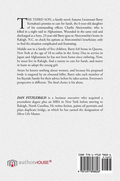 THE THIRD SON, a family novel, features Lieutenant Barry Kernahan?s promise to care for Sarah, the 6-year-old daughter of his commanding officer, Charlie Abercrombie, who is killed in a night raid in Afghanistan. Wounded in the same raid and discharged as a hero, 23-year-old Barry goes to Abercrombie?s home in Raleigh, N.C. to check his options as Abercrombie?s beneficiary, only to find the situation complicated and frustrating. Middle son in a family of five children, Barry left home in Queens, New York at the age of 18 to enlist in the Army. Due to service in Japan and Afghanistan he has not been home since enlisting. Now, he must live in Raleigh, find a nanny to care for Sarah, and marry in haste to adopt the young girl. Aware he knows nothing about women, and because his proposed bride is targeted by an obsessed killer, Barry asks each member of his Bayside family for their advice before he takes action. Everyone?s perspective is different. The final choice is his alone.