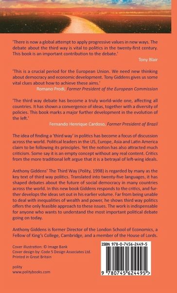 Anthony Giddens s The Third Way (Polity Press, 1998) is regarded by many as the key text of third way politics. Translated into twenty-five languages, it has shaped the development of the third way. In this new book Giddens responds to the critics, and further develops the ideas set out in his earlier volume. Far from being unable to deal with inequalities of wealth and power, he shows, third way politics offers the only feasible approach to these issues. The work is indispensable for anyone who wants to understand the most important political debate going on today.