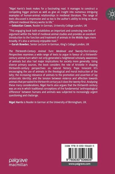 The Thirteenth-Century Animal Turn: Medieval and Twenty-First-Century Perspectives examines a wide range of texts to argue in favour of a thirteenth-century animal turn which not only generated a heightened scholarly awareness of animals but also had major implications for society more generally. Using diverse primary sources, the book considers the role of Aristotle in shaping thirteenth-century perspectives on natural history; Pope Innocent III's encouraging the use of animals in the theological and moral instruction of the laity; the increasing relevance of animals to the promotion and assertion of lay aristocratic identity; and the tension between violence and affection towards animals that pervaded the thirteenth century as it does the twenty-first. Analysing these many considerations, Nigel Harris also argues that the thirteenth century was an era in which traditional conceptions of the fundamental 'anthropological difference' between humans and animals was subjectedto increasingly urgent questioning and challenge.