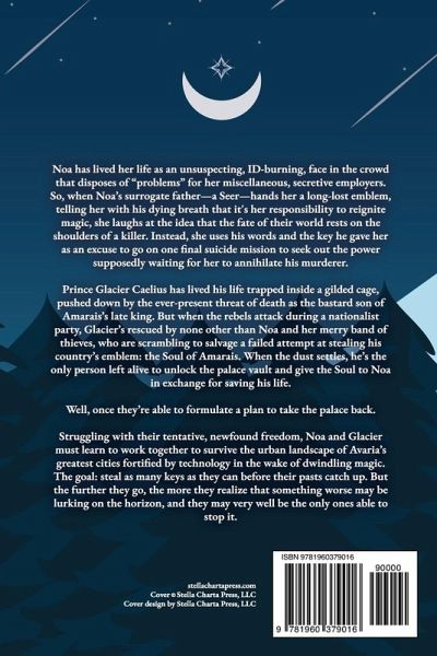 The chaotic crew of heisting misfits in Leigh Bardugo's Six of Crows meets the familiar yet fantastical, modern landscape found in Robert Jackson Bennett's City of Stairs. "The thirteen emblems given to the original rulers weren't just symbols. They're keys to the Vault-one that no one's ever opened." Noa has lived her life as an unsuspecting, ID-burning, face in the crowd that disposes of "problems" for her miscellaneous, secretive employers. So, when Noa's surrogate father-a Seer-hands her a long-lost emblem, telling her with his dying breath that it's her responsibility to reignite magic, she laughs at the idea that the fate of their world rests on the shoulders of a killer. Instead, she uses his words and the key he gave her as an excuse to go on one final suicide mission to seek out the power supposedly waiting for her to annihilate his murderer. Prince Glacier Caelius has lived his life trapped inside a gilded cage, pushed down by the ever-present threat of death as the bastard son of Amarais's late king. But when the rebels attack during a nationalist party, Glacier's rescued by none other than Noa and her merry band of thieves, who are scrambling to salvage a failed attempt at stealing his country's emblem: the Soul of Amarais. When the dust settles, he's the only person left alive to unlock the palace vault and give the Soul to Noa in exchange for saving his life. Well, once they're able to formulate a plan to take the palace back. Struggling with their tentative, newfound freedom, Noa and Glacier must learn to work together to survive the urban landscape of Avaria's greatest cities fortified by technology in the wake of dwindling magic. The goal: steal as many keys as they can before their pasts catch up. But the further they go, the more they realize that something worse may be lurking on the horizon, and they may very well be the only ones able to stop it.