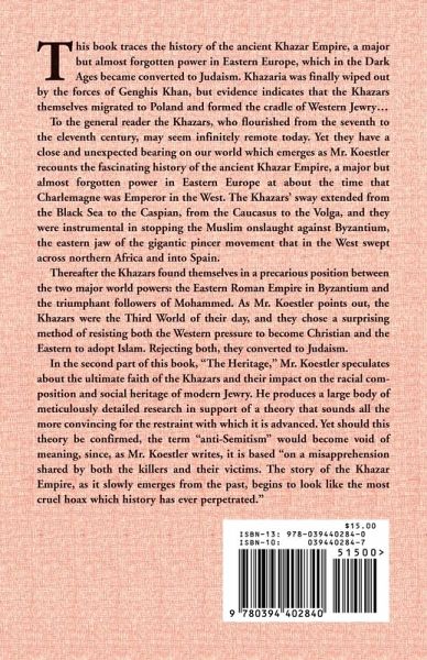 This book traces the history of the ancient Khazar Empire, a major but almost forgotten power in Eastern Europe, which in the Dark Ages converted to Judaism. Khazaria was finally wiped out by the forces of Ghengis Khan, but evidence indicates that the Khazars themselves migrated to Poland and formed the cradle of Western Jewry.
