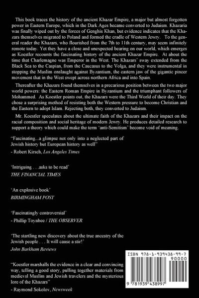 All original edition. Nothing added, nothing removed. This book traces the history of the ancient Khazar Empire, a major but almost forgotten power in Eastern Europe, which in the Dark Ages became converted to Judaism. Khazaria was finally wiped out by the forces of Genghis Khan, but evidence indicates that the Khazars themselves migrated to Poland and formed the cradle of Western Jewry. To the general reader the Khazars, who flourished from the 7th to 11th century, may seem infinitely remote today. Yet they have a close and unexpected bearing on our world, which emerges as Koestler recounts the fascinating history of the ancient Khazar Empire. At about the time that Charlemagne was Emperor in the West. The Khazars' sway extended from the Black Sea to the Caspian, from the Caucasus to the Volga, and they were instrumental in stopping the Muslim onslaught against Byzantium, the eastern jaw of the gigantic pincer movement that in the West swept across northern Africa and into Spain. Thereafter the Khazars found themselves in a precarious position between the two major world powers: the Eastern Roman Empire in Byzantium and the triumphant followers of Mohammed. As Koestler points out, the Khazars were the Third World of their day. They chose a surprising method of resisting both the Western pressure to become Christian and the Eastern to adopt Islam. Rejecting both, they converted to Judaism. Mr. Koestler speculates about the ultimate faith of the Khazars and their impact on the racial composition and social heritage of modern Jewry. He produces detailed research to support a theory which could make the term 'anti-Semitism' become void of meaning.