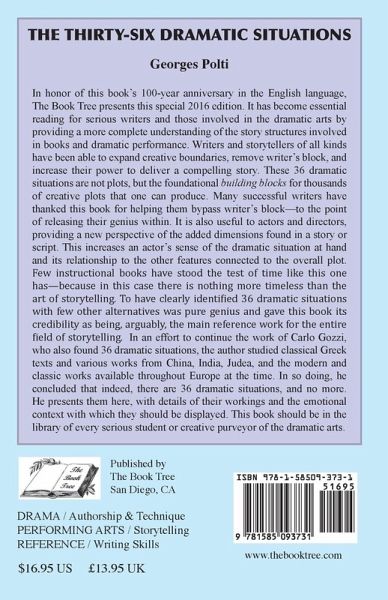 In honor of this book’s 100-year anniversary in the English language, The Book Tree presents this special 2016 edition. It has become essential reading for serious writers and those involved in the dramatic arts by providing a more complete understanding of the story structures involved in books and dramatic performance. Writers and storytellers of all kinds have been able to expand creative boundaries, remove writer’s block, and increase their power to deliver a compelling story. These 36 dramatic situations are not plots, but the foundational building blocks for thousands of creative plots that one can produce. Many successful writers have thanked this book for helping them bypass writer’s block—to the point of releasing their genius within. It is also useful to actors and directors, providing a new perspective of the added dimensions found in a story or script. This increases an actor’s sense of the dramatic situation at hand and its relationship to the other features connected to the overall plot. Few instructional books have stood the test of time like this one has—because in this case there is nothing more timeless than the art of storytelling. To have clearly identified 36 dramatic situations with few other alternatives was pure genius and gave this book its credibility as being, arguably, the main reference work for the entire field of storytelling. In an effort to continue the work of Carlo Gozzi, who also found 36 dramatic situations, the author studied classical Greek texts and various works from China, India, Judea, and the modern and classic works available throughout Europe at the time. In so doing, he concluded that indeed, there are 36 dramatic situations, and no more. He presents them here, with details of their workings and the emotional context with which they should be displayed. This book should be in the library of every serious student or creative purveyor of the dramatic arts.